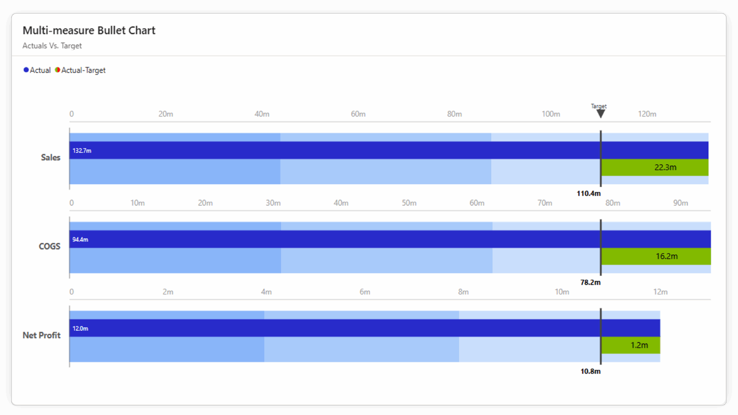 Multi-measure Bullet Bar: Designed to track and compare multiple metrics against their respective targets. It supports individual scaling while maintaining a consistent target position, enabling clear performance comparisons across different measures such as profit, orders, quantity, and variance. This chart type is also commonly used to replicate the IBCS bullet chart templates.