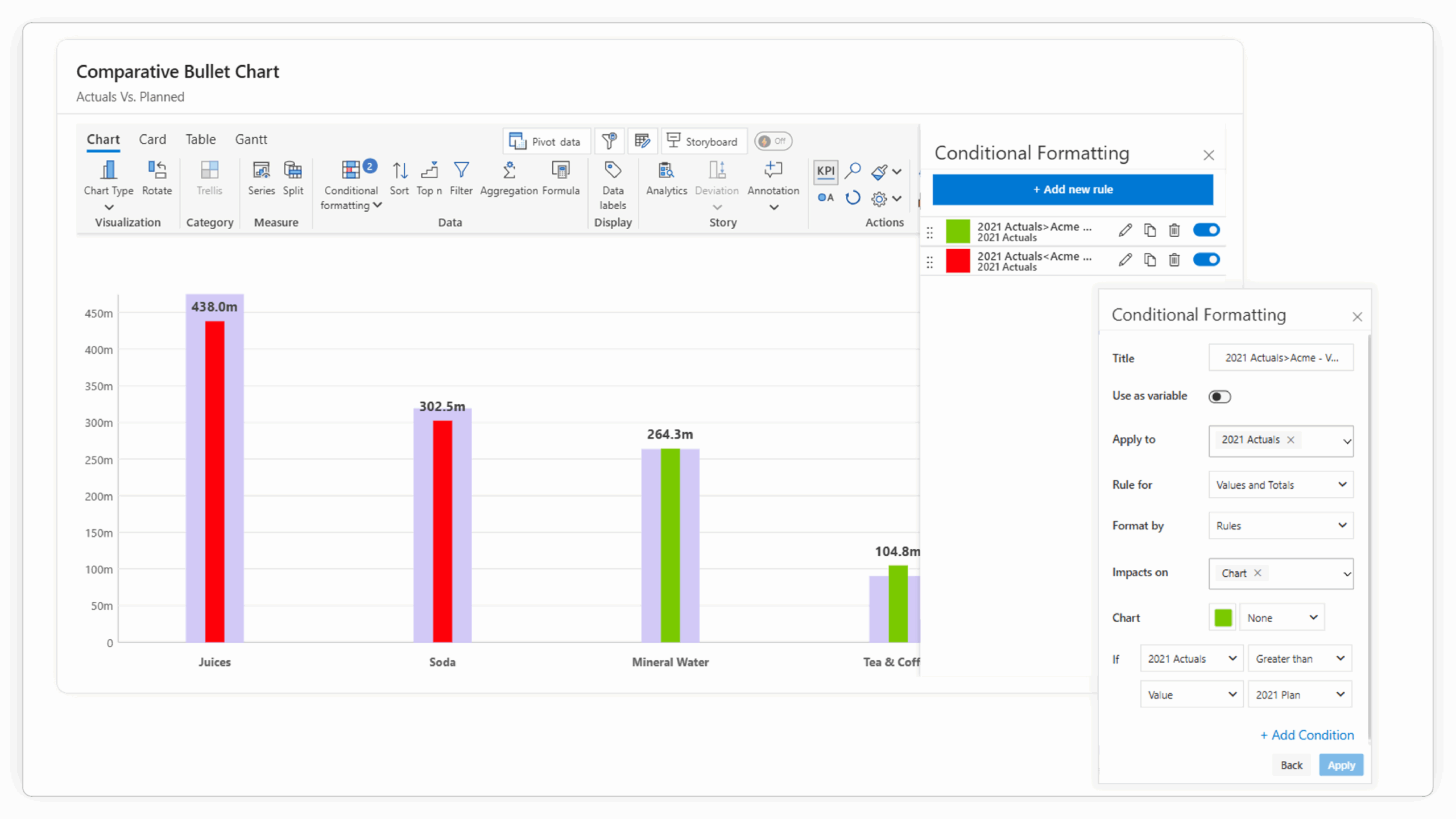 Conditional Formatting: Apply advanced conditional formatting rules to your bullet chart elements (bars, target markers, comparison bands) based on actual, target, or variance values, making critical performance insights immediately apparent.