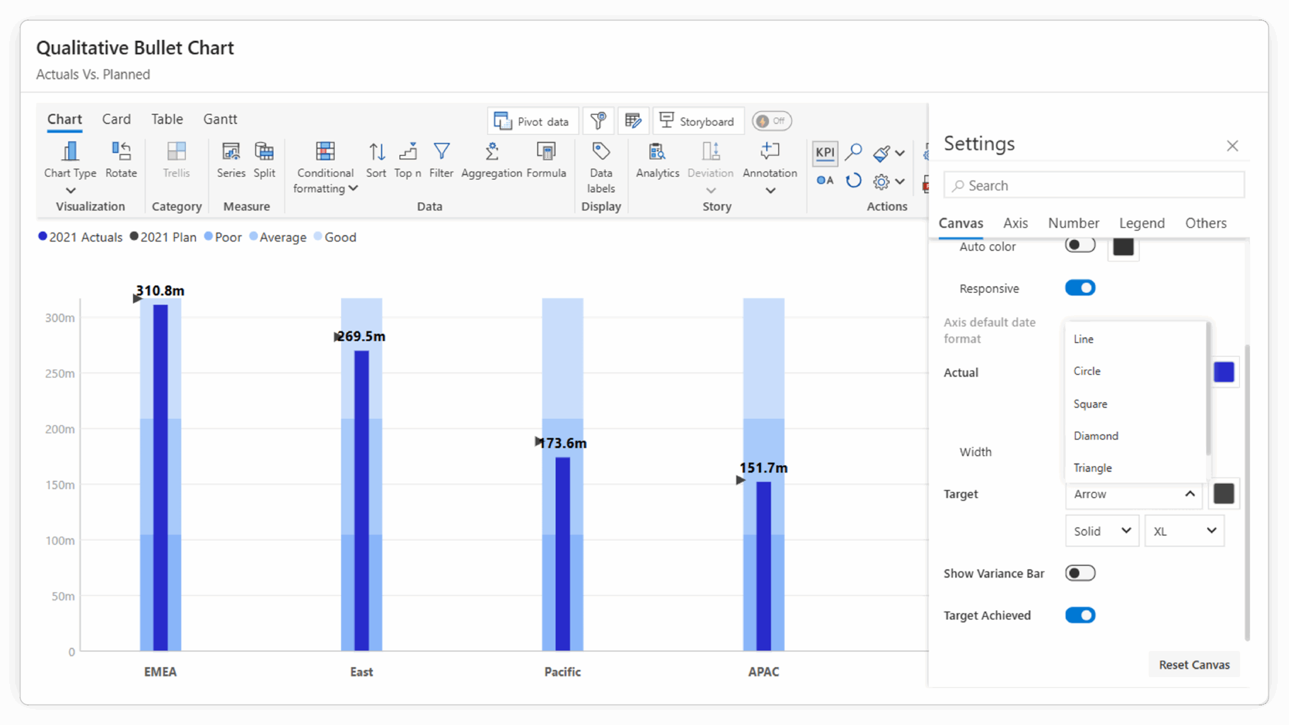 Target Markers: Customize target markers with multiple styles (arrow, line, circle) and granular control over their pattern, width, and size, allowing you to clearly define your goals within the bullet chart itself.