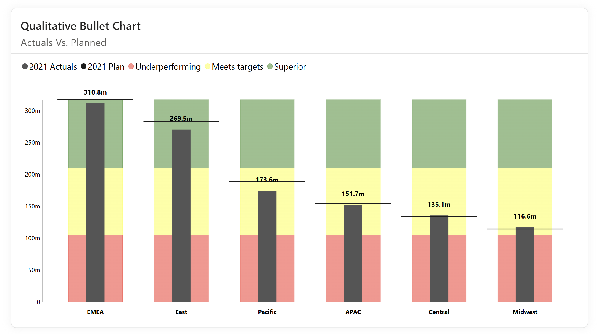 Qualitative Bullet Column: Adds context using distinct color bands (e.g., red for 'Underperforming', yellow for 'Meets targets', green for 'Superior'). This provides a clear visual cue about performance quality, not just the numerical value.