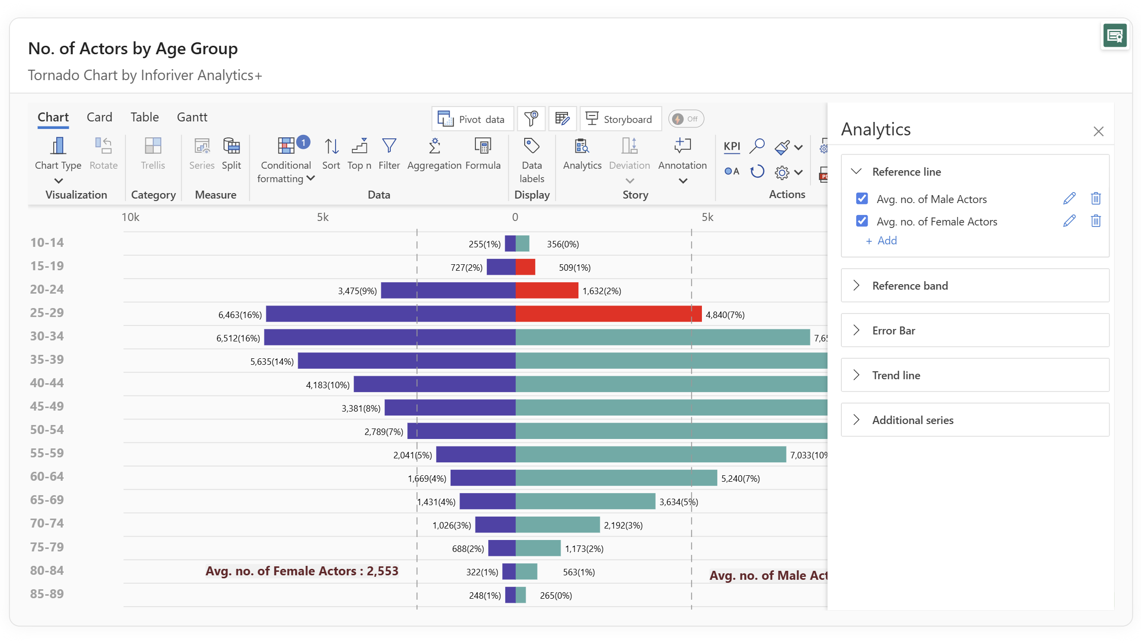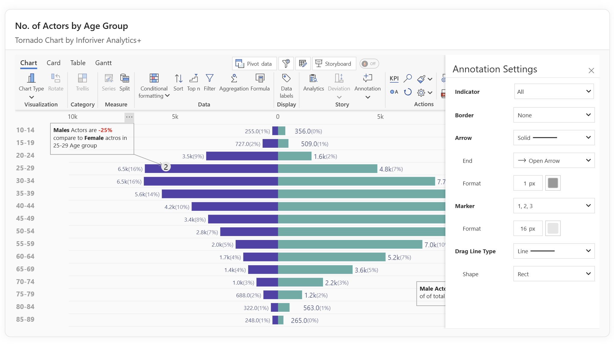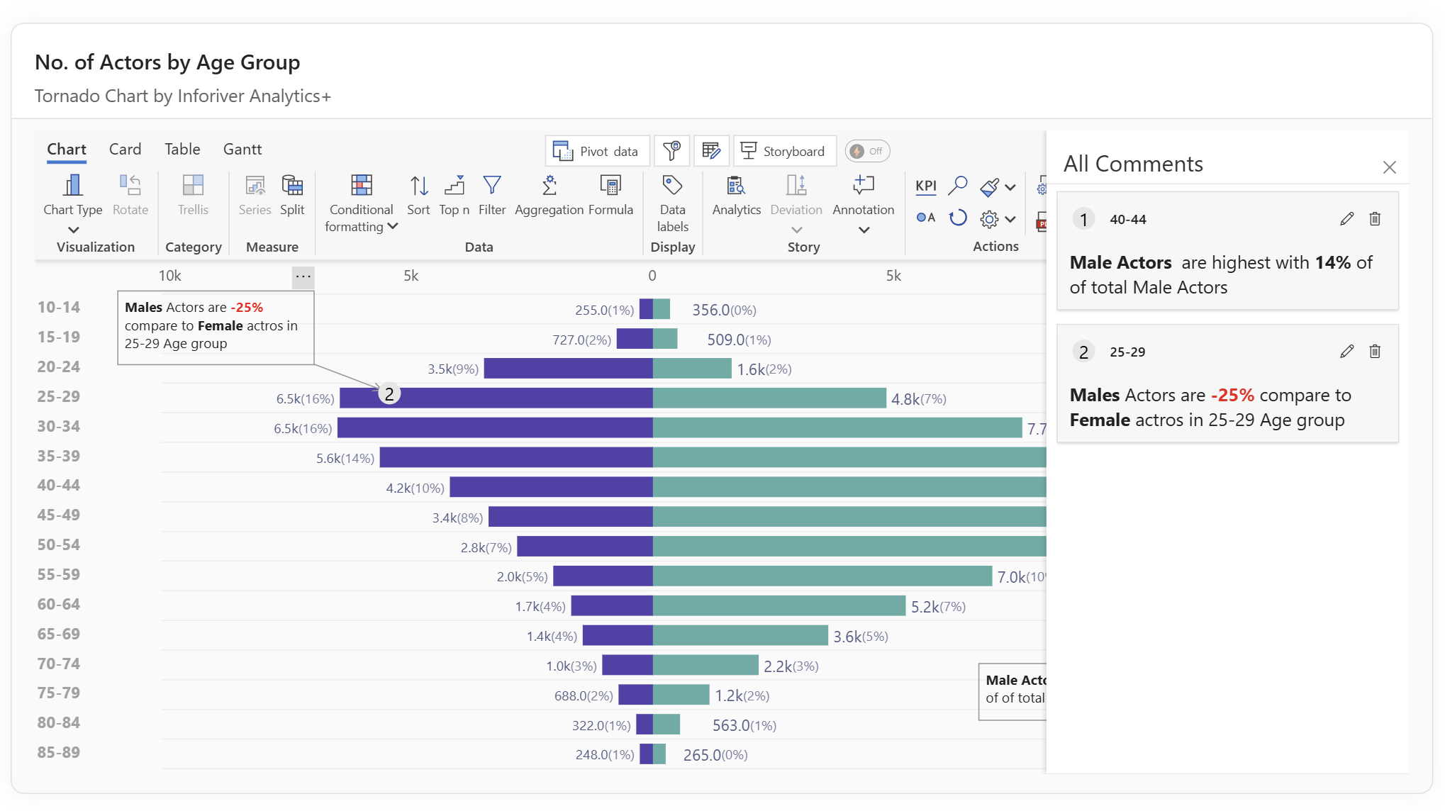 When it comes to visualizing comparative data, Inforiver Analytics+ elevates the presentation of Tornado charts in Microsoft Power BI. As a Power BI Certified Visual, it significantly enhances data visualization and storytelling. It offers an intuitive, no-code user experience, allowing professionals to build Tornado chart in minutes.