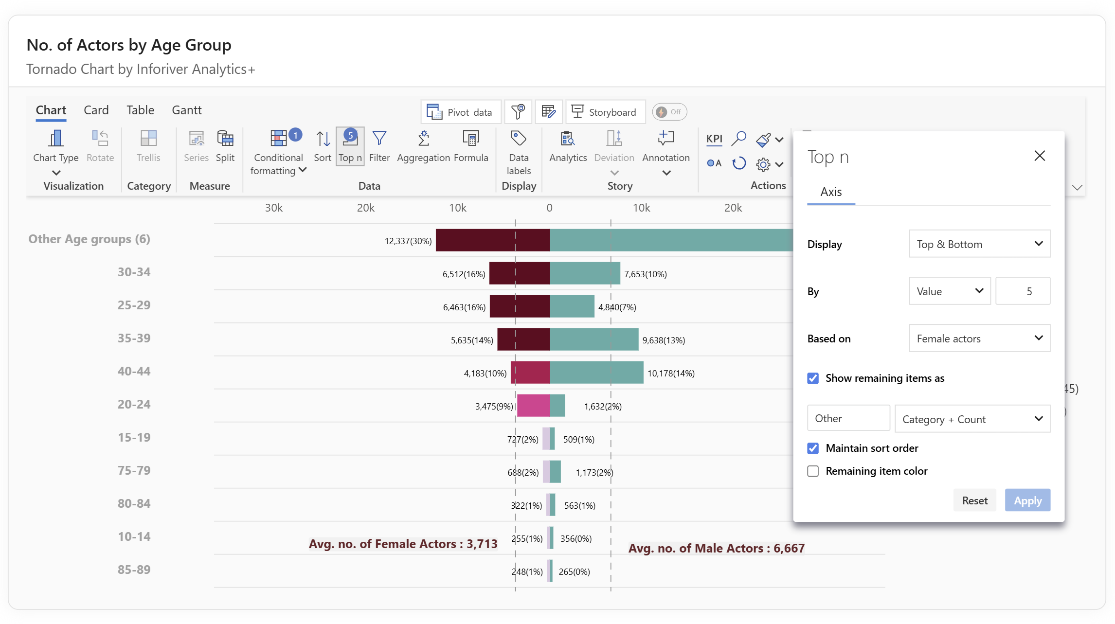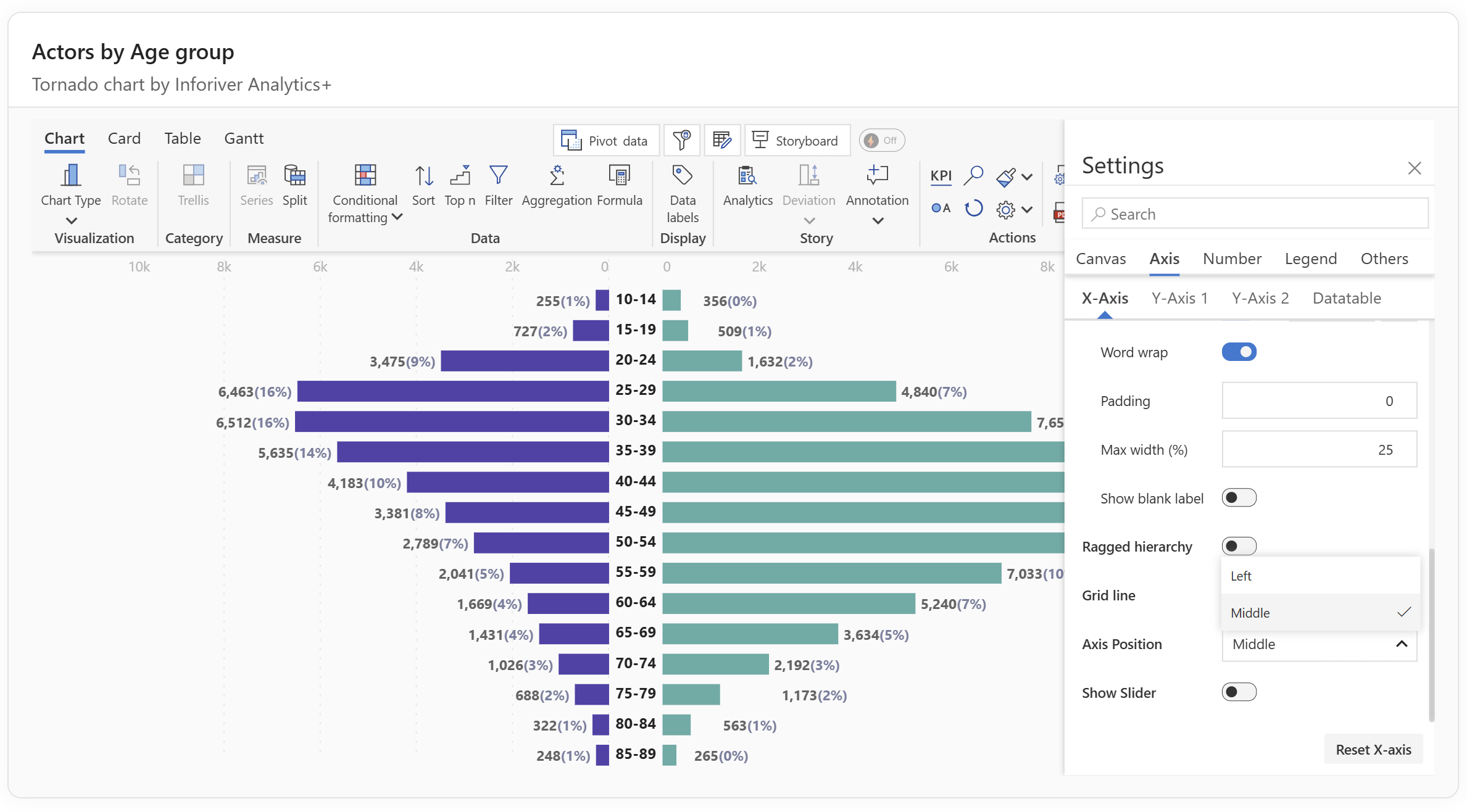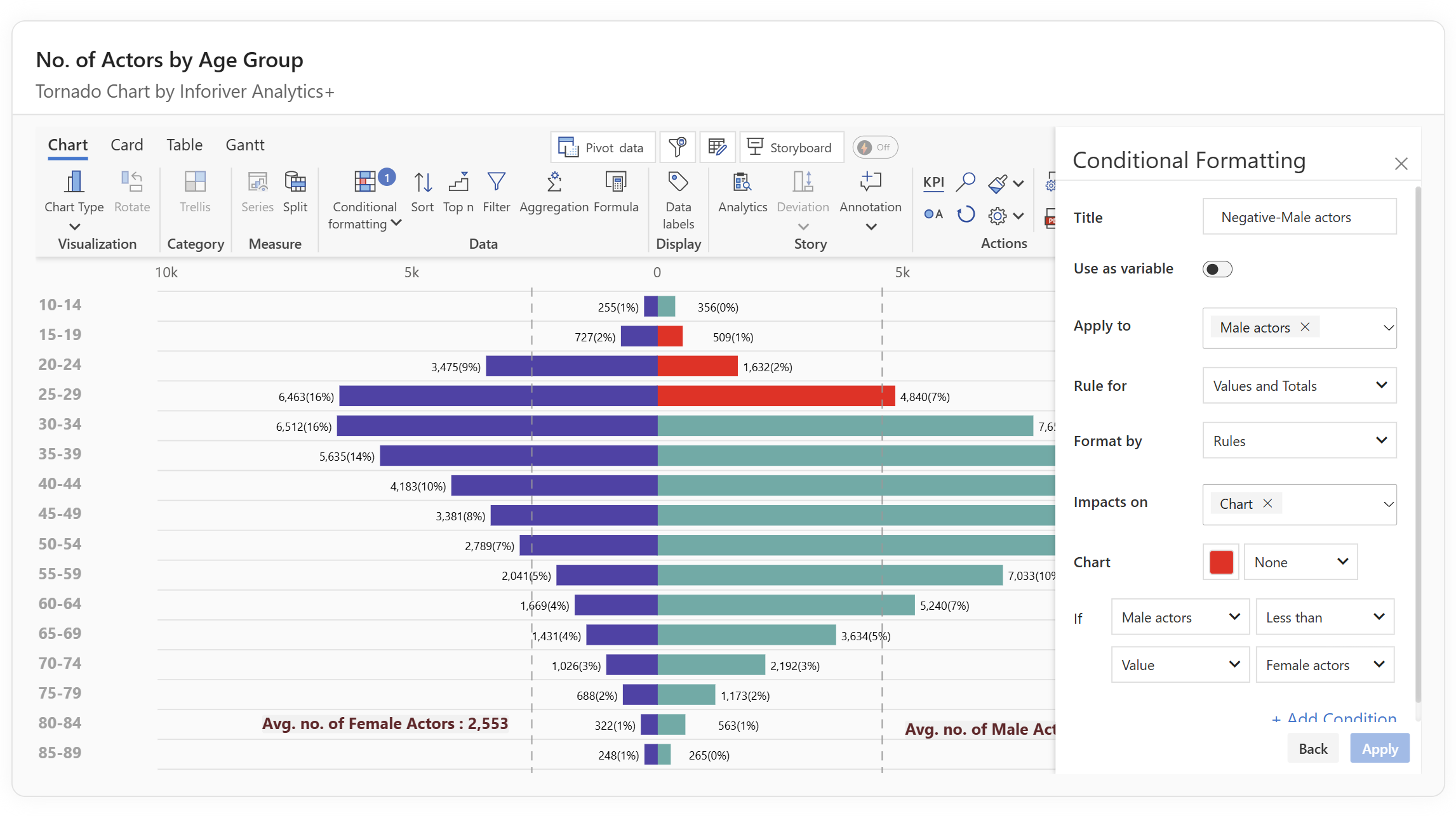 When it comes to visualizing comparative data, Inforiver Analytics+ elevates the presentation of Tornado charts in Microsoft Power BI. As a Power BI Certified Visual, it significantly enhances data visualization and storytelling. It offers an intuitive, no-code user experience, allowing professionals to build Tornado chart in minutes.