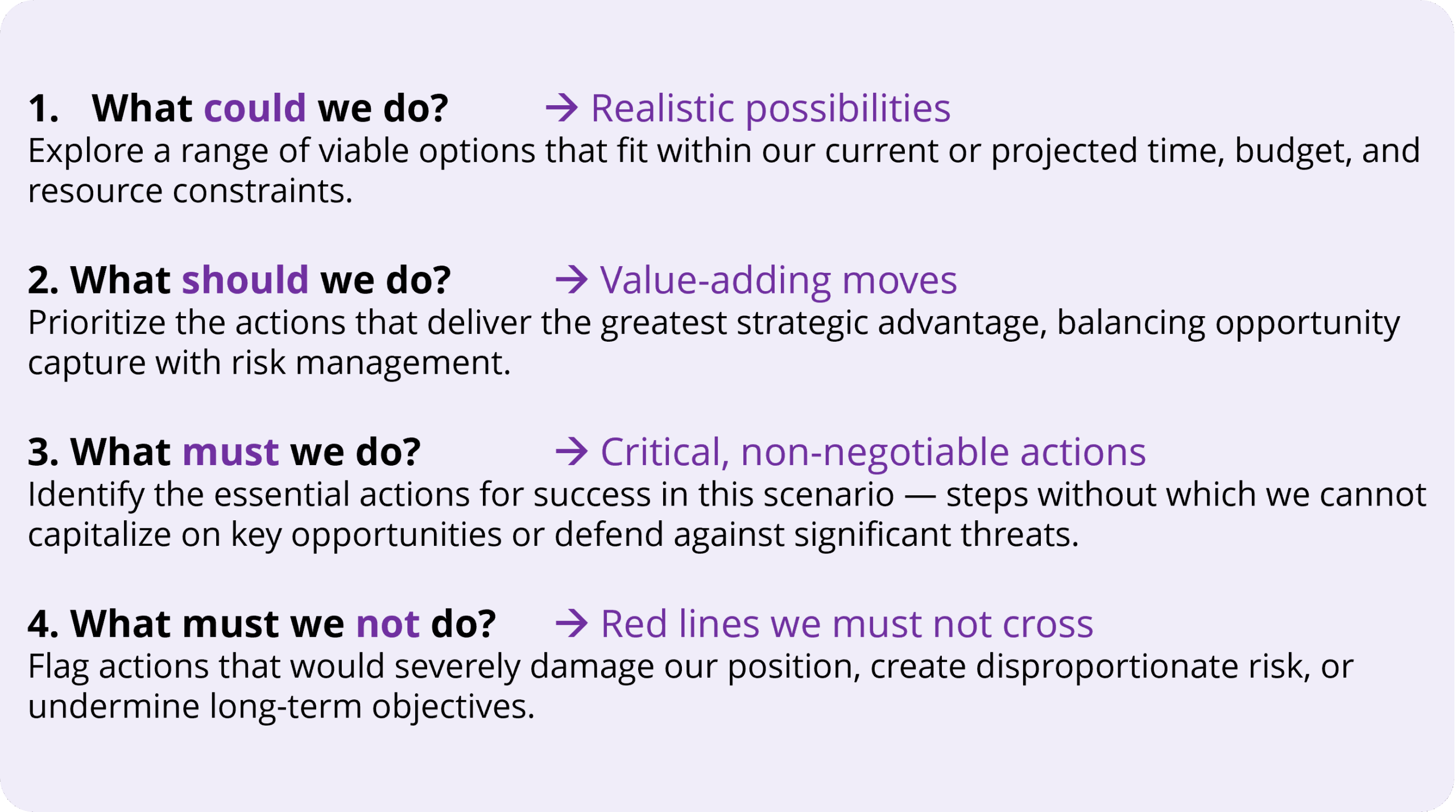 7. Recommend Strategic Responses: For each scenario, develop specific, concrete, and actionable plans. Your recommendations should cover what you could do, should do, must do, and must not do to succeed.