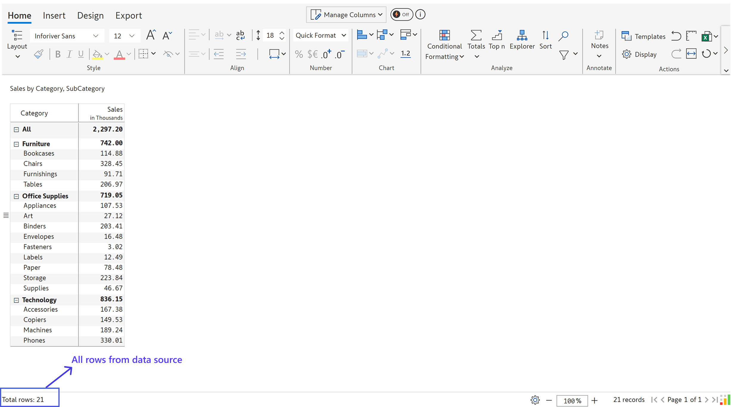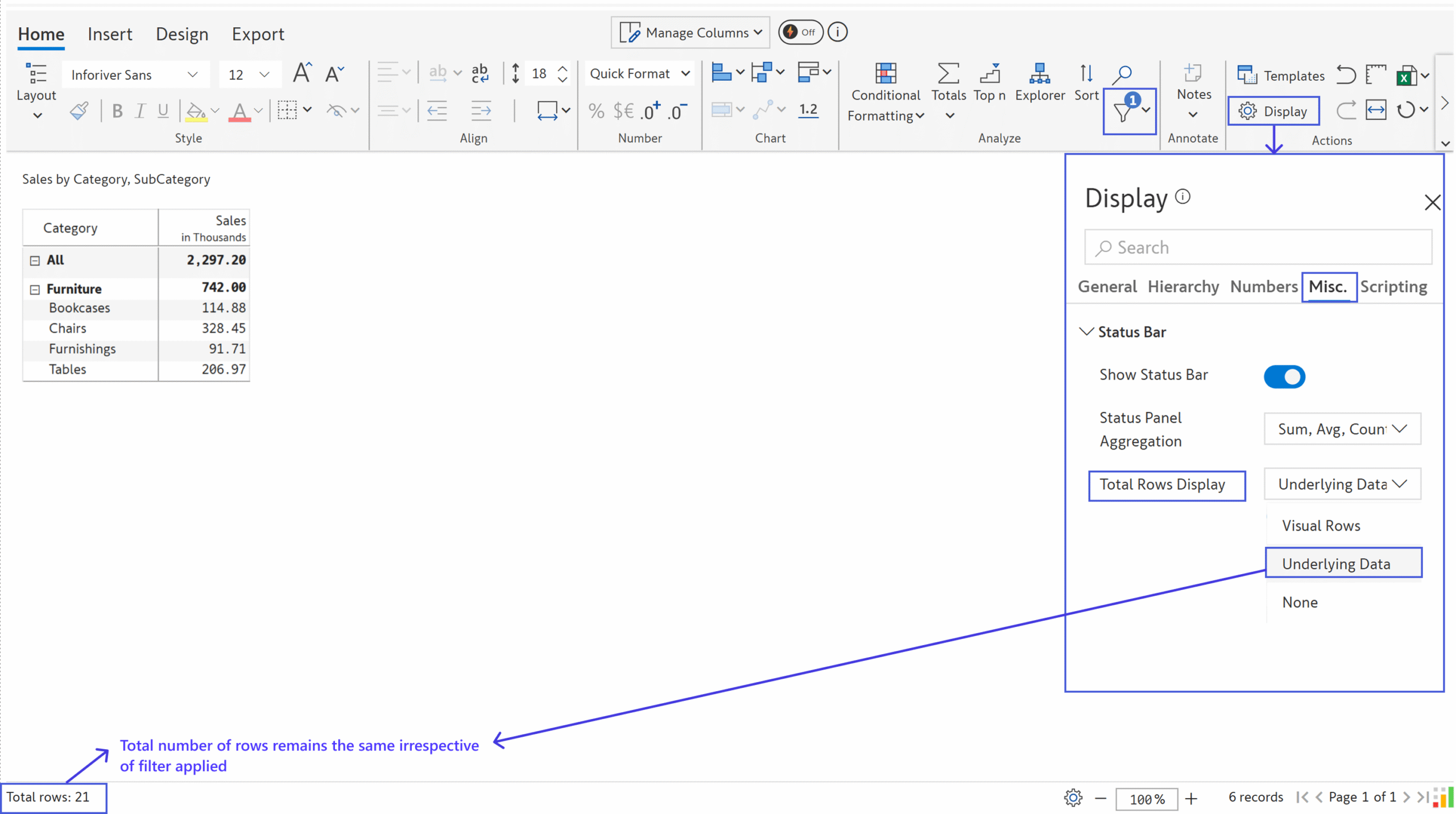 If your data has 21 rows and you’ve applied a Inforiver filter, this count still shows 21.