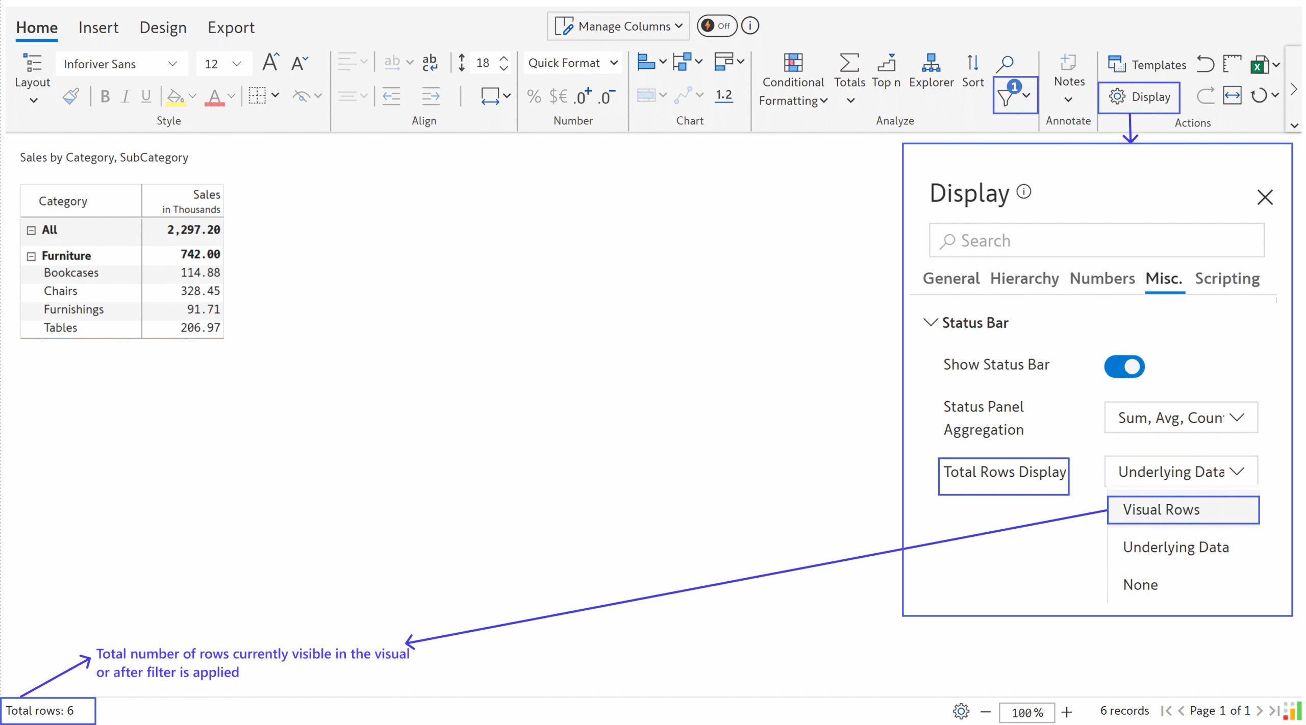 This option displays the total number of records passed to the visual from the data source, regardless of whether they are visible in the matrix.